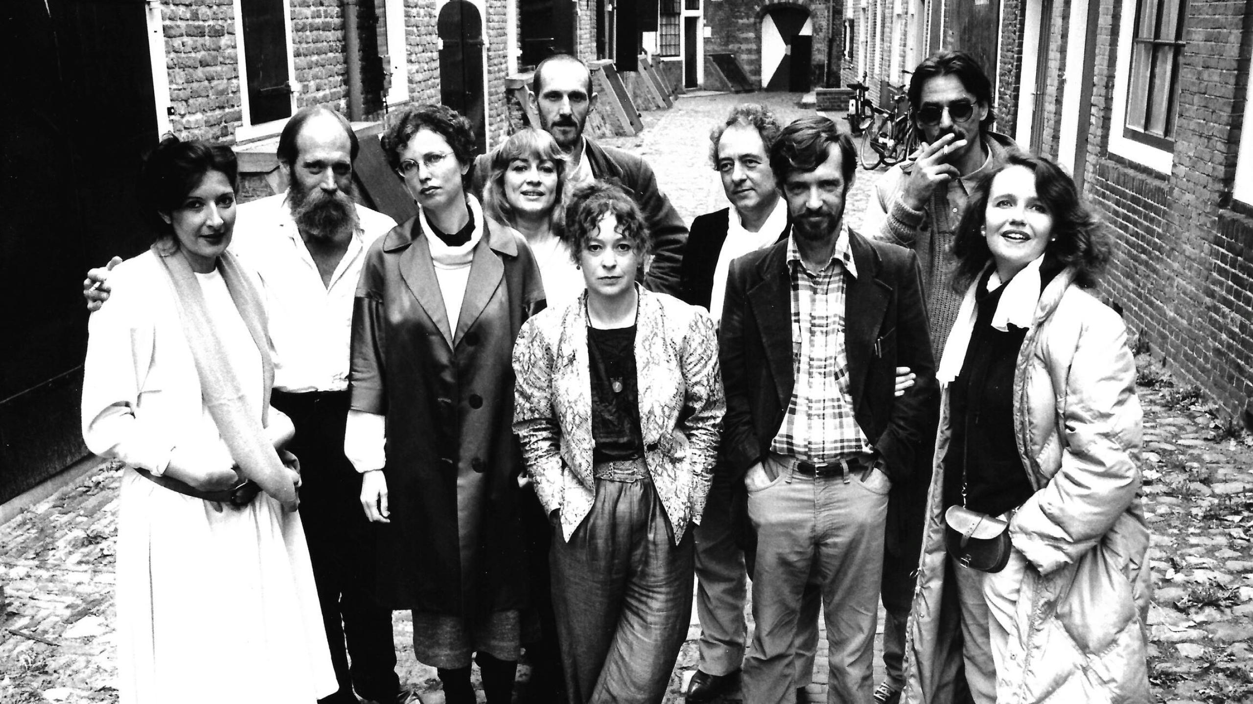 right: Marina Abramović, Lawrence Weiner, Michelle Zaugg, Jill Purce, Rémy Zaugg, Maria-Rosa Boezem, Daniel Buren, Thomas McEvilley, Ulay and Maura Sheehan during Forum En Scene, Kuiperspoort Middelburg, 1984. photo: Wim Riemens. Collection archive Maria-Rosa and Marinus Boezem.